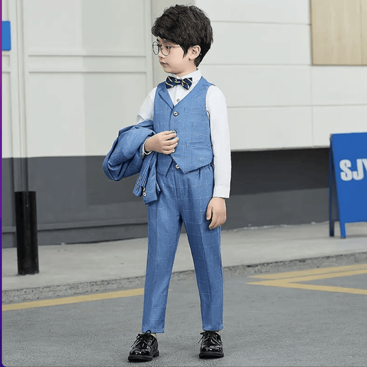 Uzvalks zēnam zils ar rūtiņām. 4-daļīgs slim-fit uzvalks