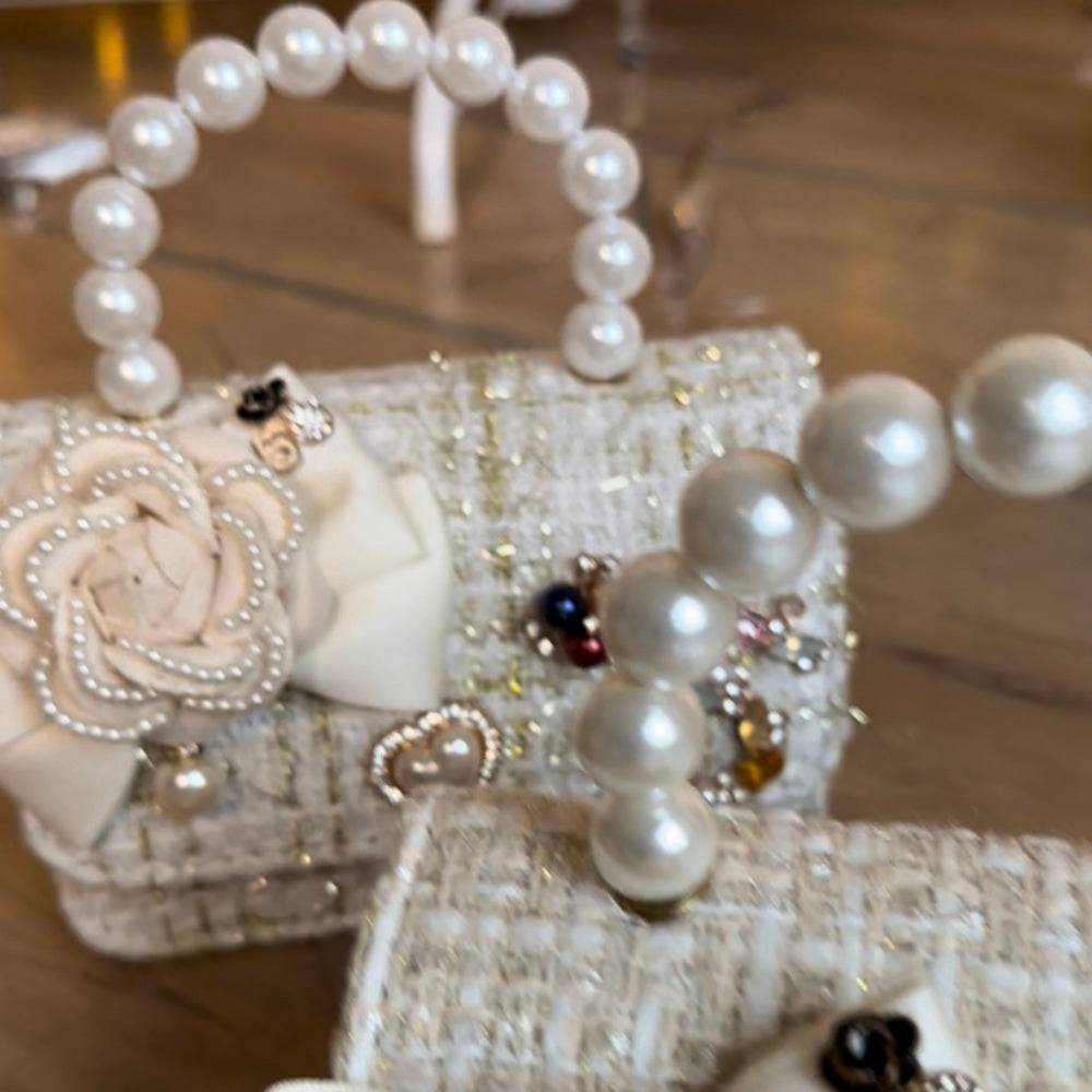 Maza, gaišas krāsas rokassomiņa meitenei, dekorēta ar auduma ziediņu. Somiņai ir pērlīšu rokturis un zeltīta plecu ķēdīte.