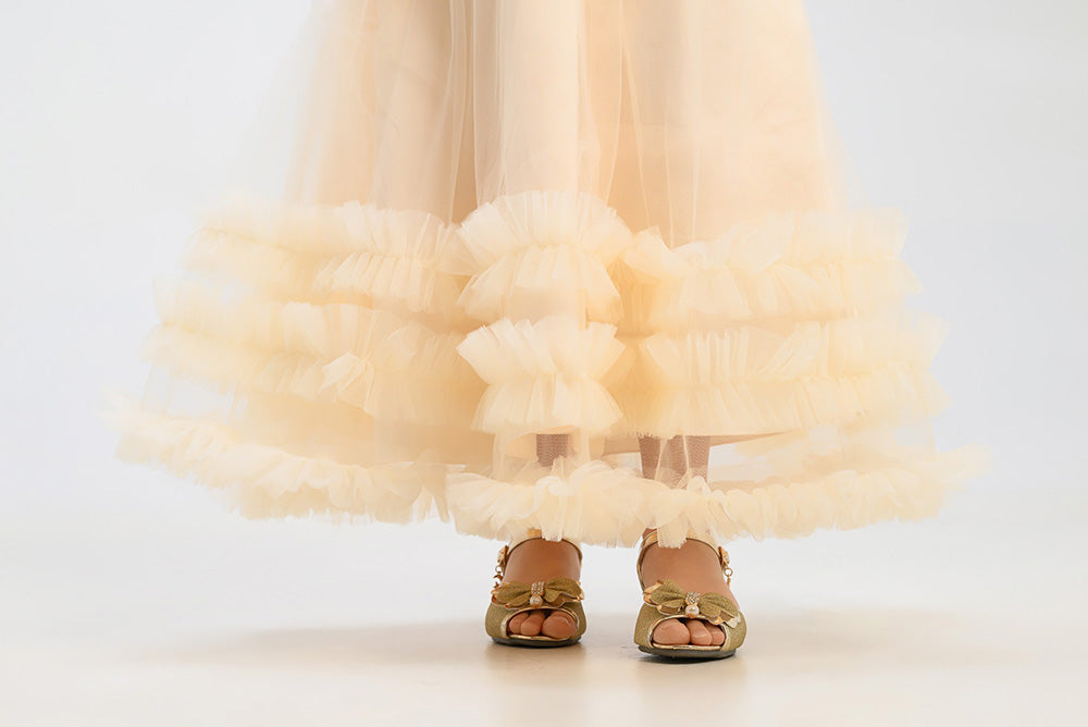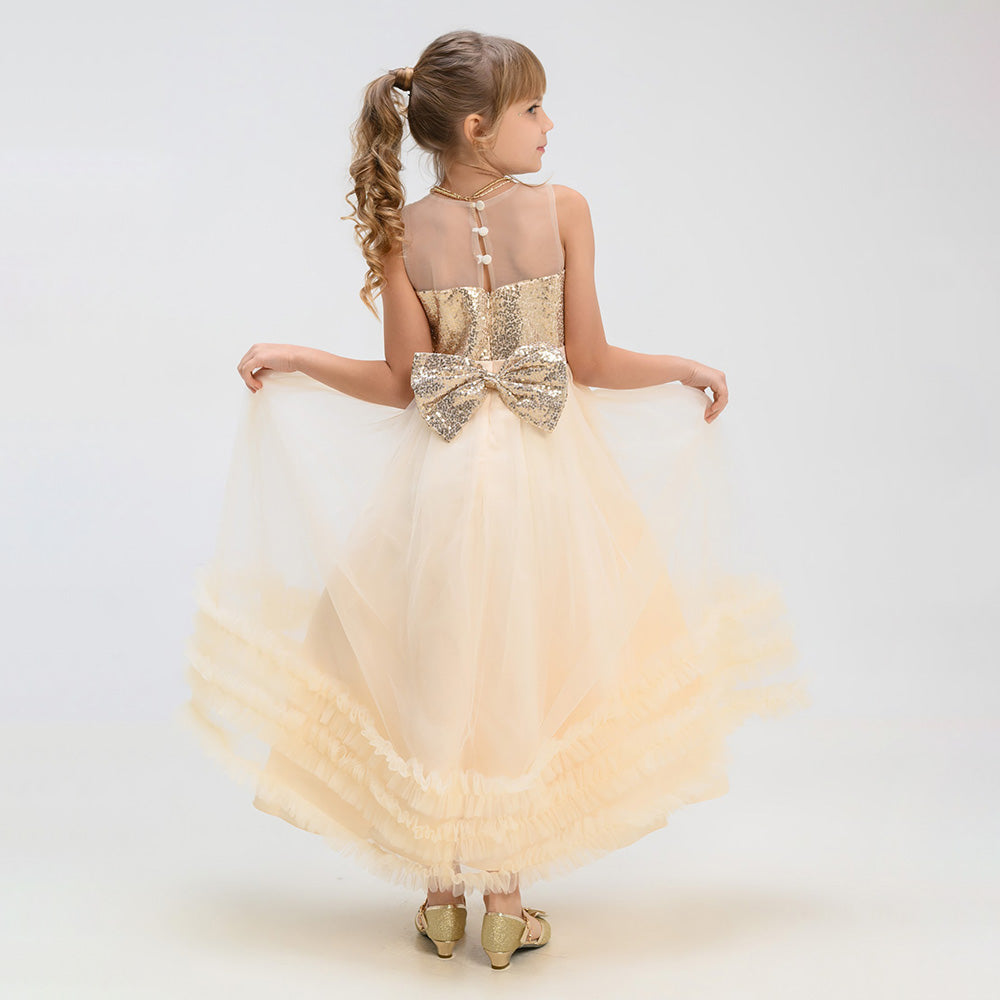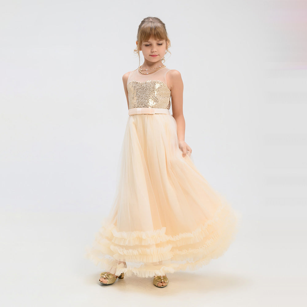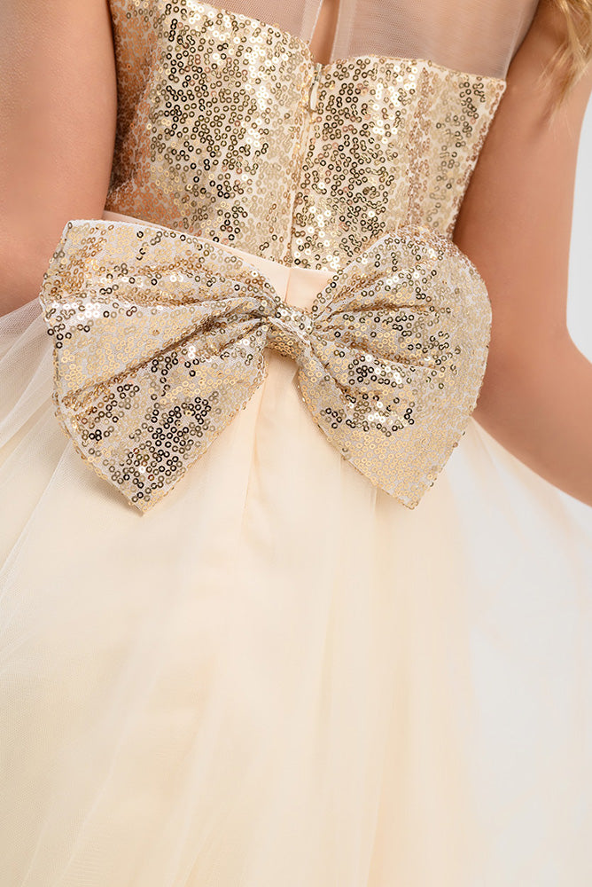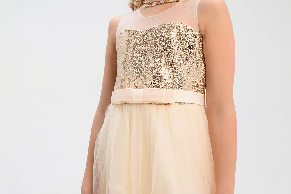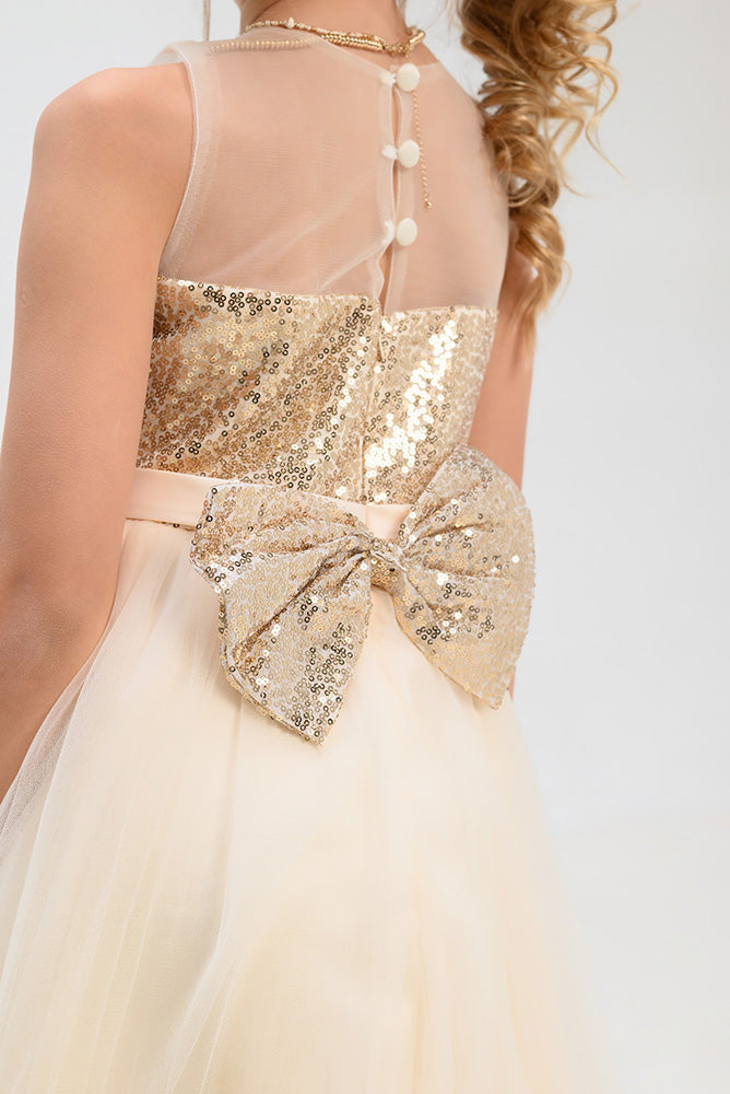 Gara svētku kleita meitenei šampanieša krāsā ar zelta fliteriem. Aizdare aizmugurē-rāvējslēdzējs.
