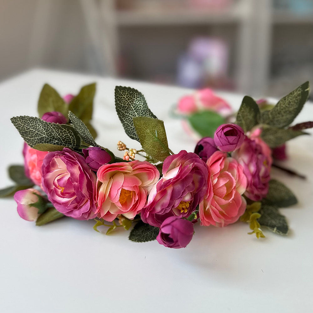 Mākslīgo ziedu vainadziņš, biezs, sasienams ar lentām, vainadziņa garums 43 cm.