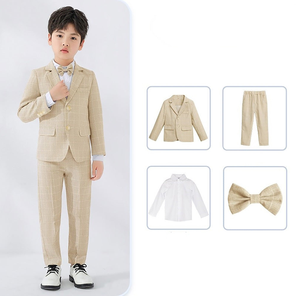 Kvalitatīvs, ērts, plāns, bēšas krāsas rūtots uzvalks zēniem. Komplektā ietilpst bikses, žakete, krekls, tauriņš. Biksēm vidukļa daļa uz gumijas.