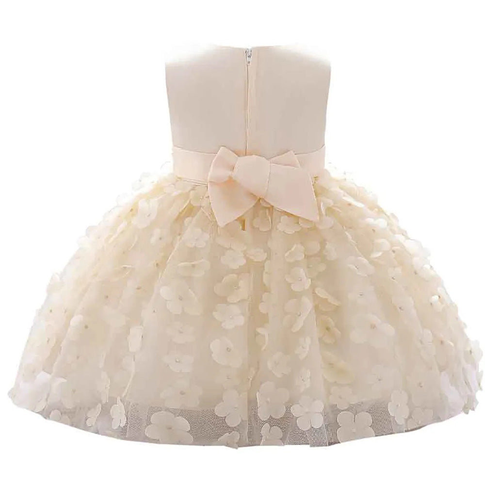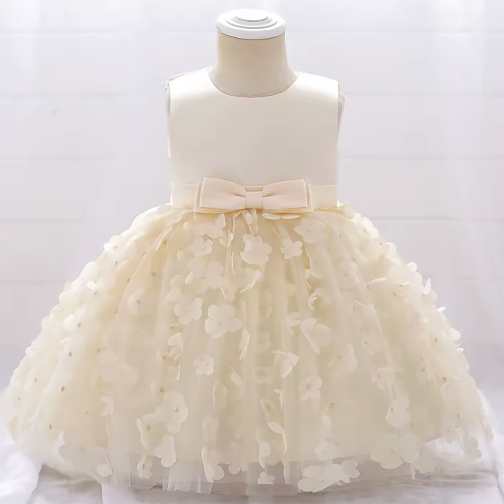 Romantiska, bēšas krāsas bērnu kleitiņa ar 3D ziedu dekoru. Aizdare aizmugurē-rāvējslēdzējs. Kokvilnas odere. Vidukļa daļa regulējama ar aizmugurē sasienamām lentām.